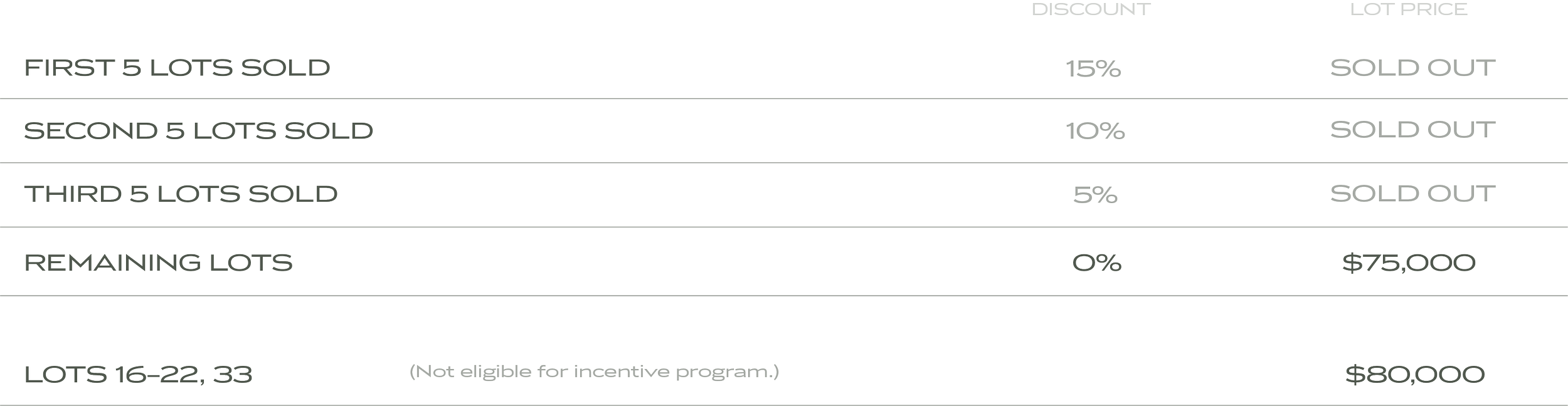 Be in one of the first groups to purchase your lot to be eligible for our most generous incentives.
